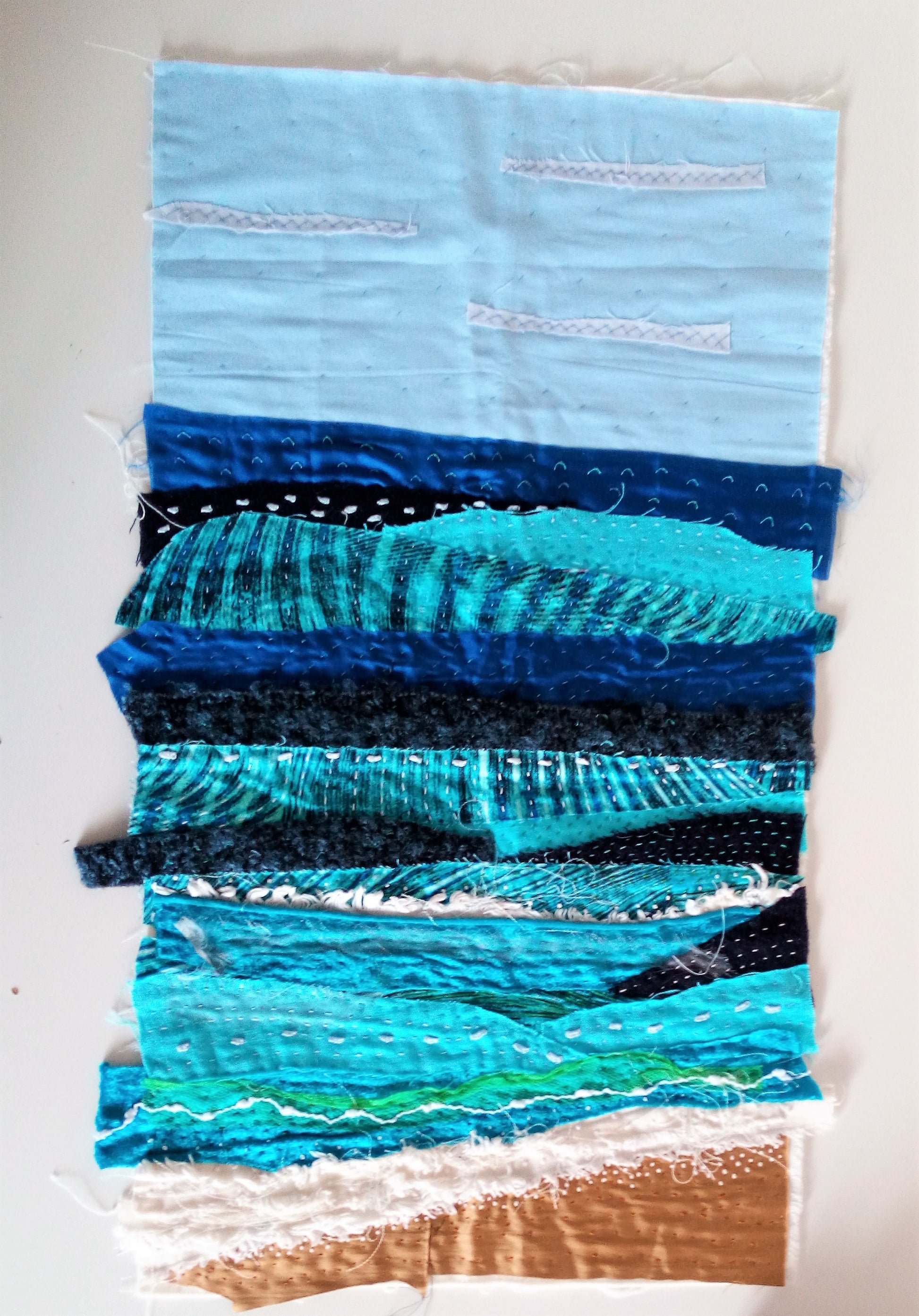 You’ll discover how subtle changes in fabric and stitch can evoke sky, fields, trees, water, hills or coastline — transforming simple materials into a striking stitched scene.