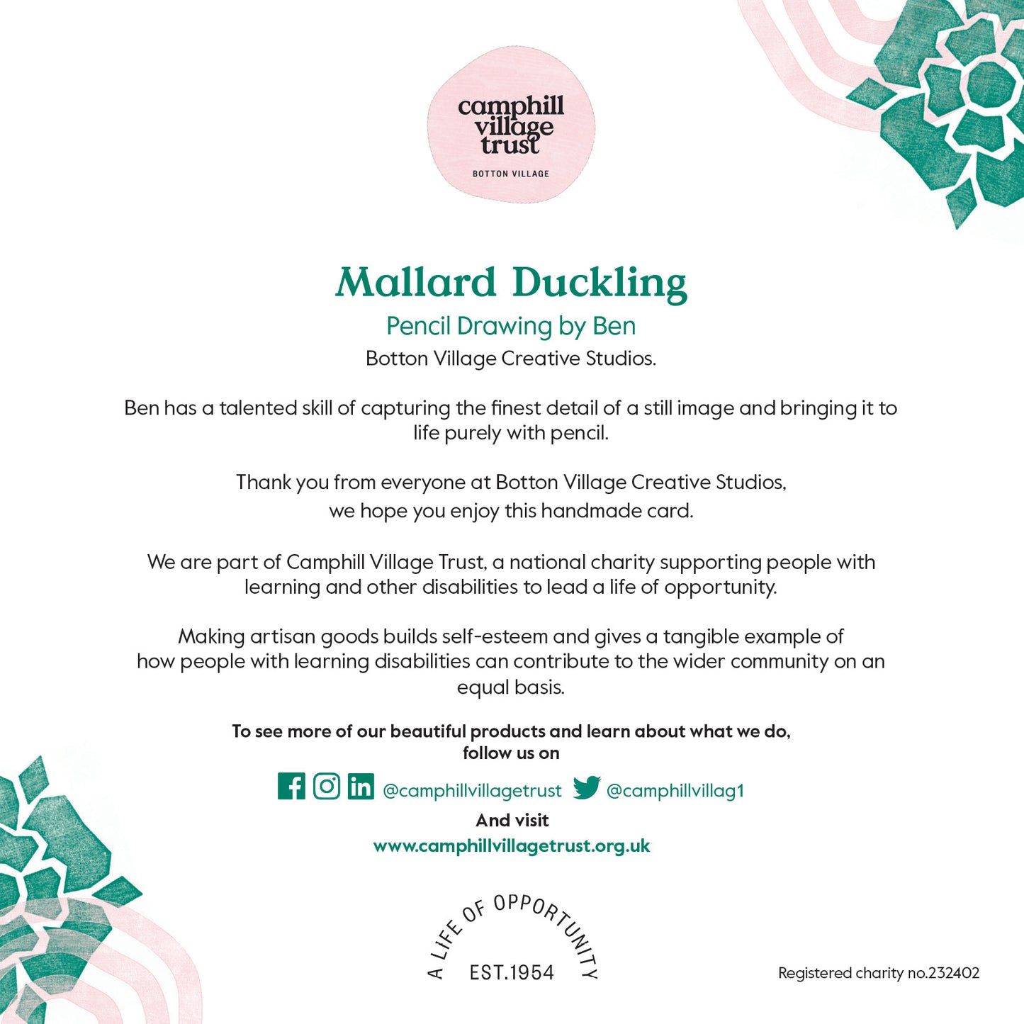 Ben attends the Botton Village Creative Studio on a daily basis. During his time here, Ben has created this Mallard Duckling pencil drawing. The support of our creative environment has provided Ben with both a supportive and creative space to enable him to focus and encourage his fine art interest and ability and most of all let his true talent shine.