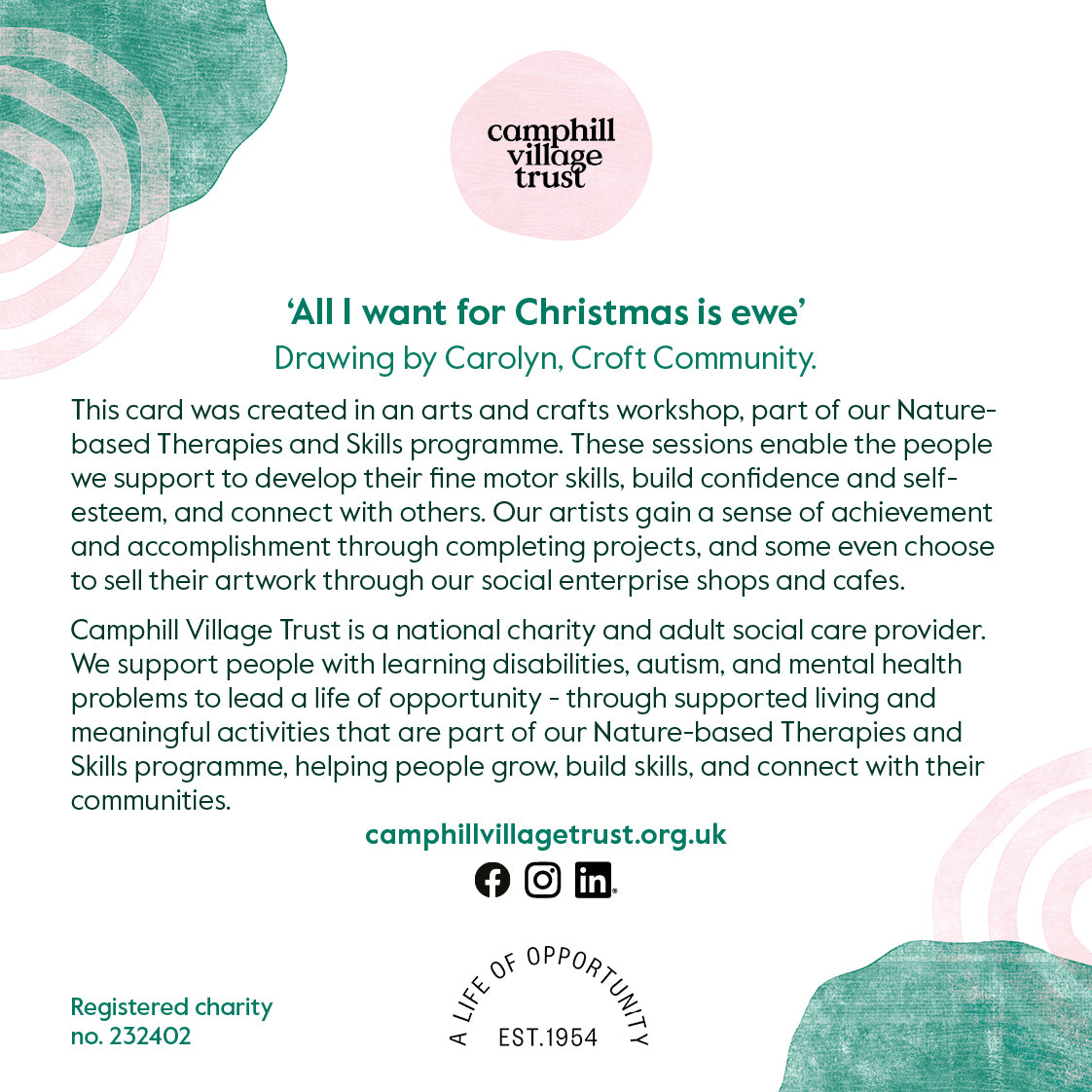 This card was created in an arts and crafts workshop, part of our Nature-based Therapies and Skills programme. These sessions enable the people we support to develop their fine motor skills, build confidence and self-esteem, and connect with others. Our artists gain a sense of achievement and accomplishment through completing projects, and some even choose to sell their artwork through our social enterprise shops and cafés.